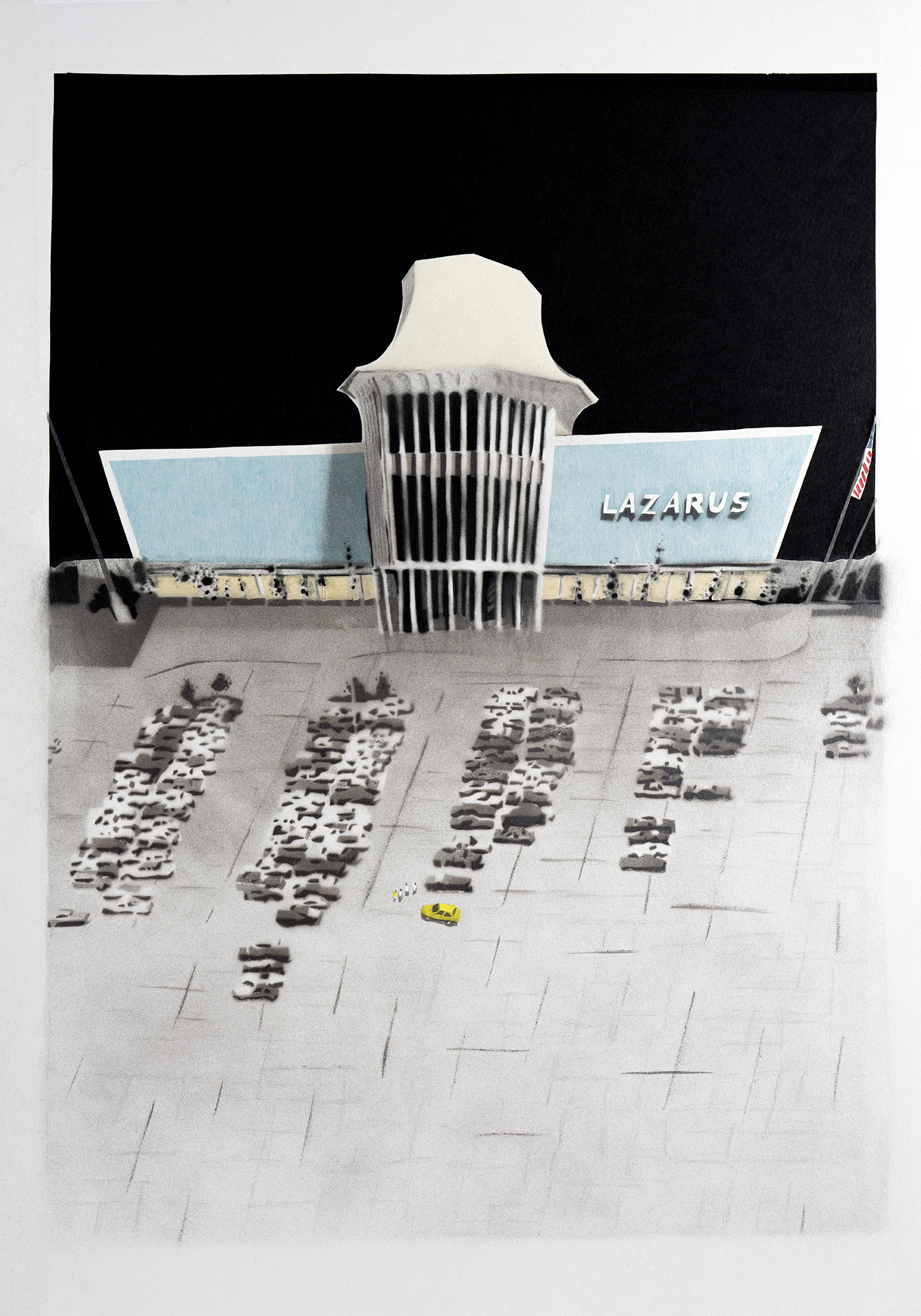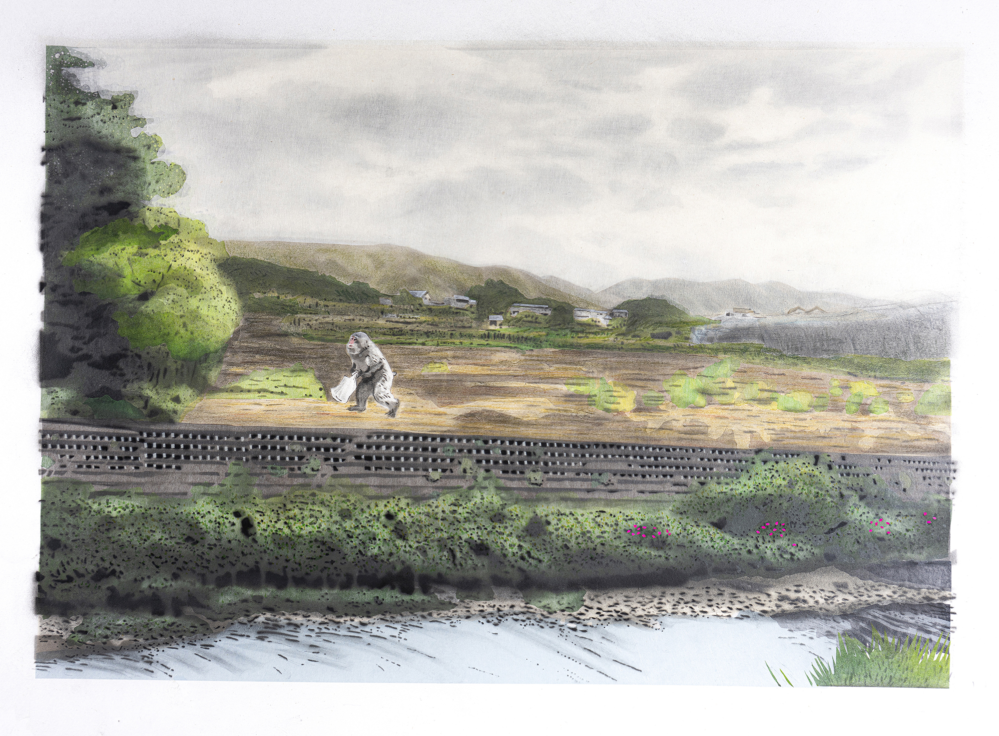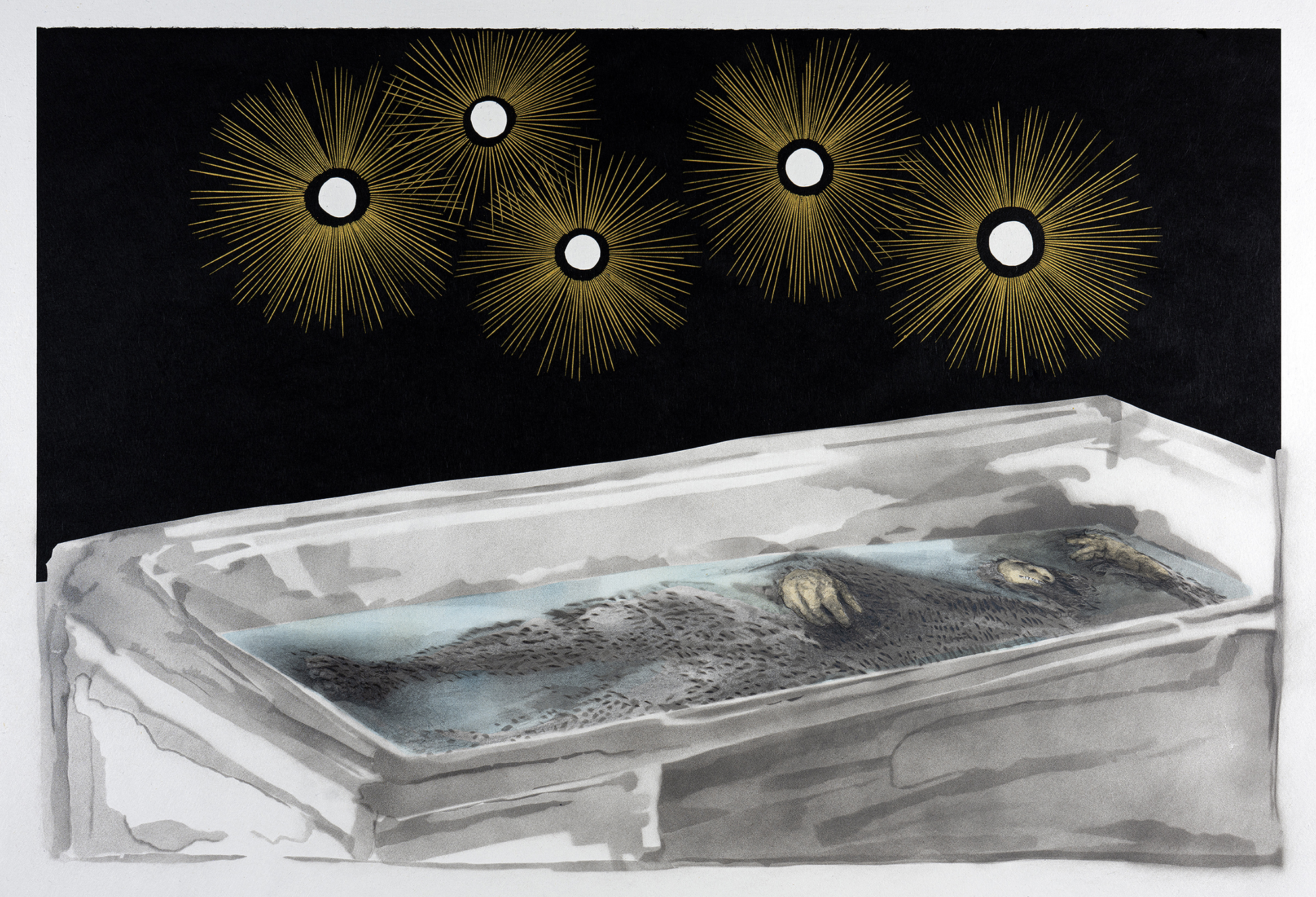 Graphite, lacquer spray paint, felt tip pen, gampi paper, gouache on Somerset Satin,